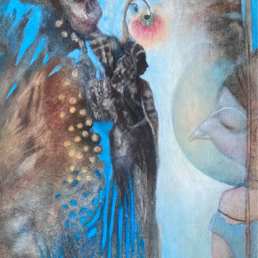 I was introduced to intuitive painting while studying art at Naropa University in Boulder, Colorado. My teachers were Robert Spellman, Joan Anderson and later, Nick Bantock, a renowned collage artist and author. My surface is wood and canvas. I start a piece without a specific idea in mind, by drawing lines and shapes followed by pools of diluted acrylic or oil color. Fragments of a story are revealed by lifting paint, adding and erasing pencil marks, sanding. When it works, it feeling is that someone else is leading my hand, as though I am carving imaginary shapes in wood and fog.